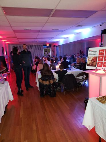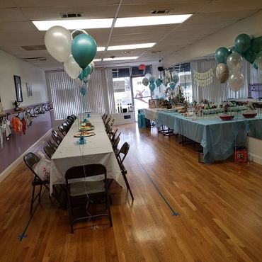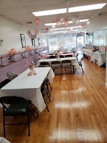Our spacious, immaculate facility sits 50-55 people comfortably. The rental fee includes tables and chairs, buffet tables for food, coffee urn, tea urn, and mid sized refrigerator. There is a stereo for entertainment, large screen TV and wireless internet. The most affordable party room in town!